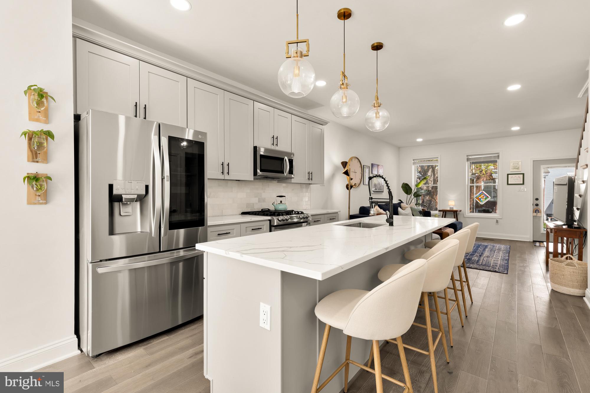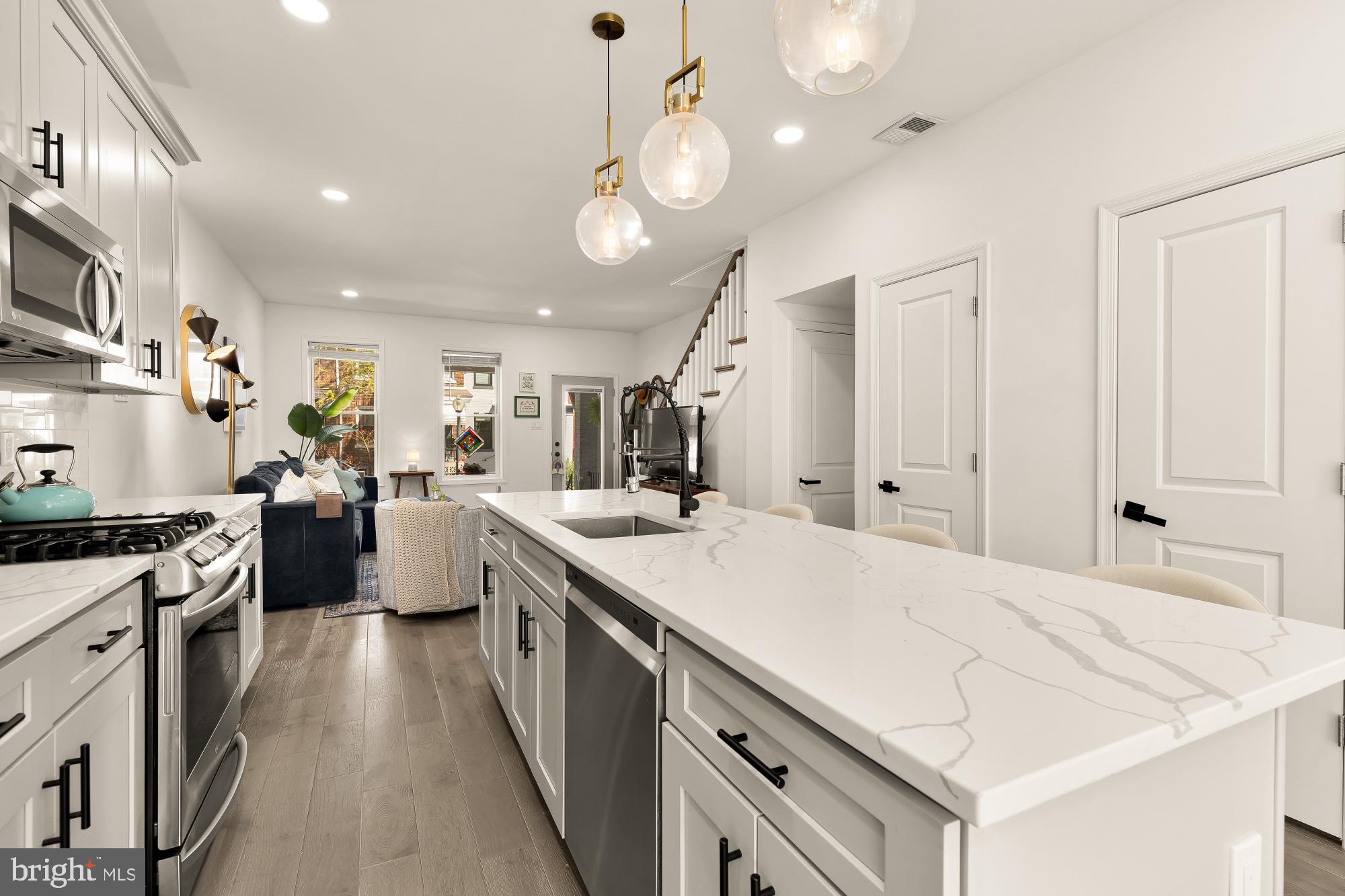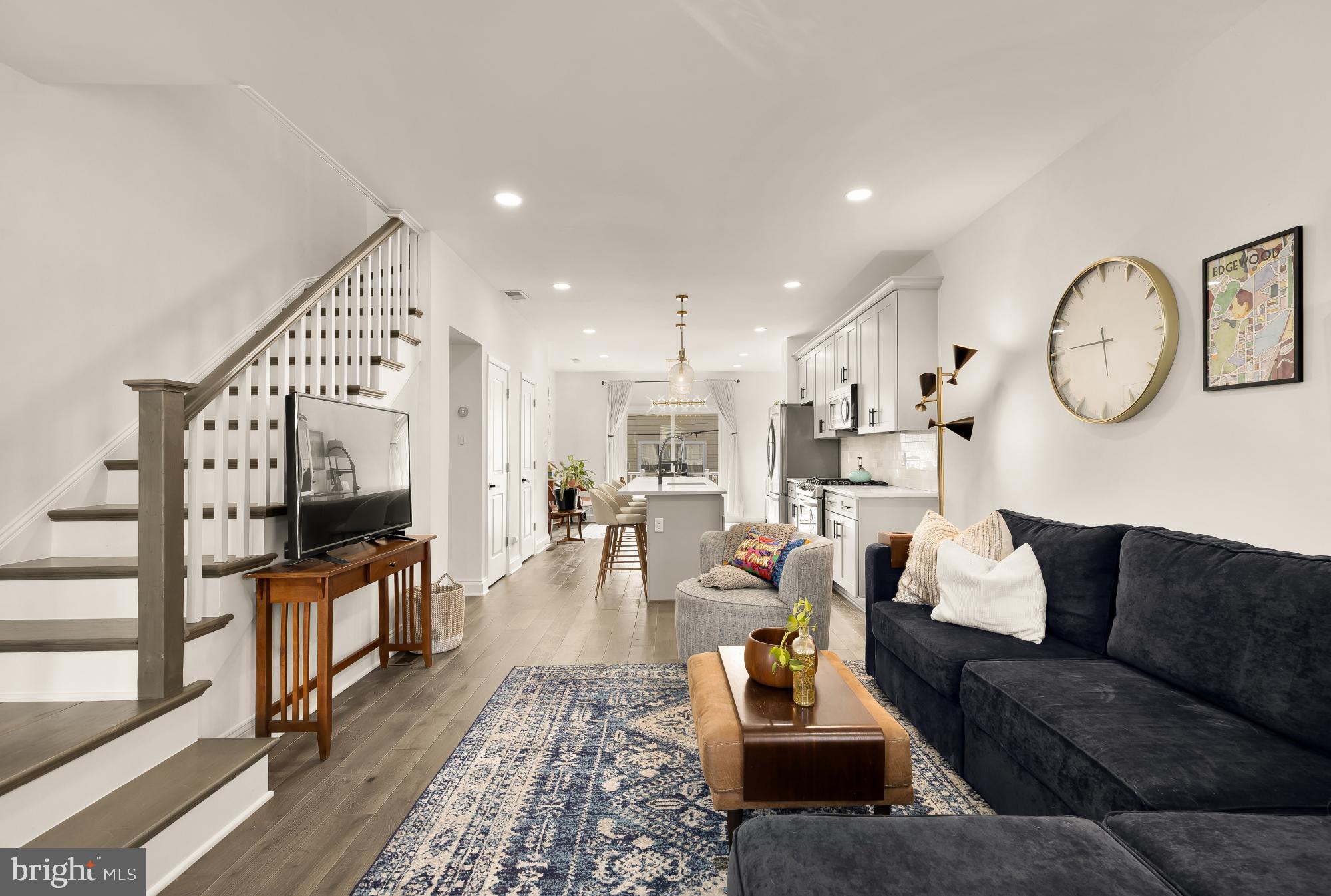 The main level is open, bright, and easy to live in, anchored by a well-designed kitchen with quartz countertops, marble tile backsplash, stainless steel appliances, gas range, and a large island that naturally becomes the center of the home. Living and dining flow seamlessly off the kitchen, with hardwood floors throughout the main and upper levels, and easy access to the rear deck--perfect for relaxing or having friends over.