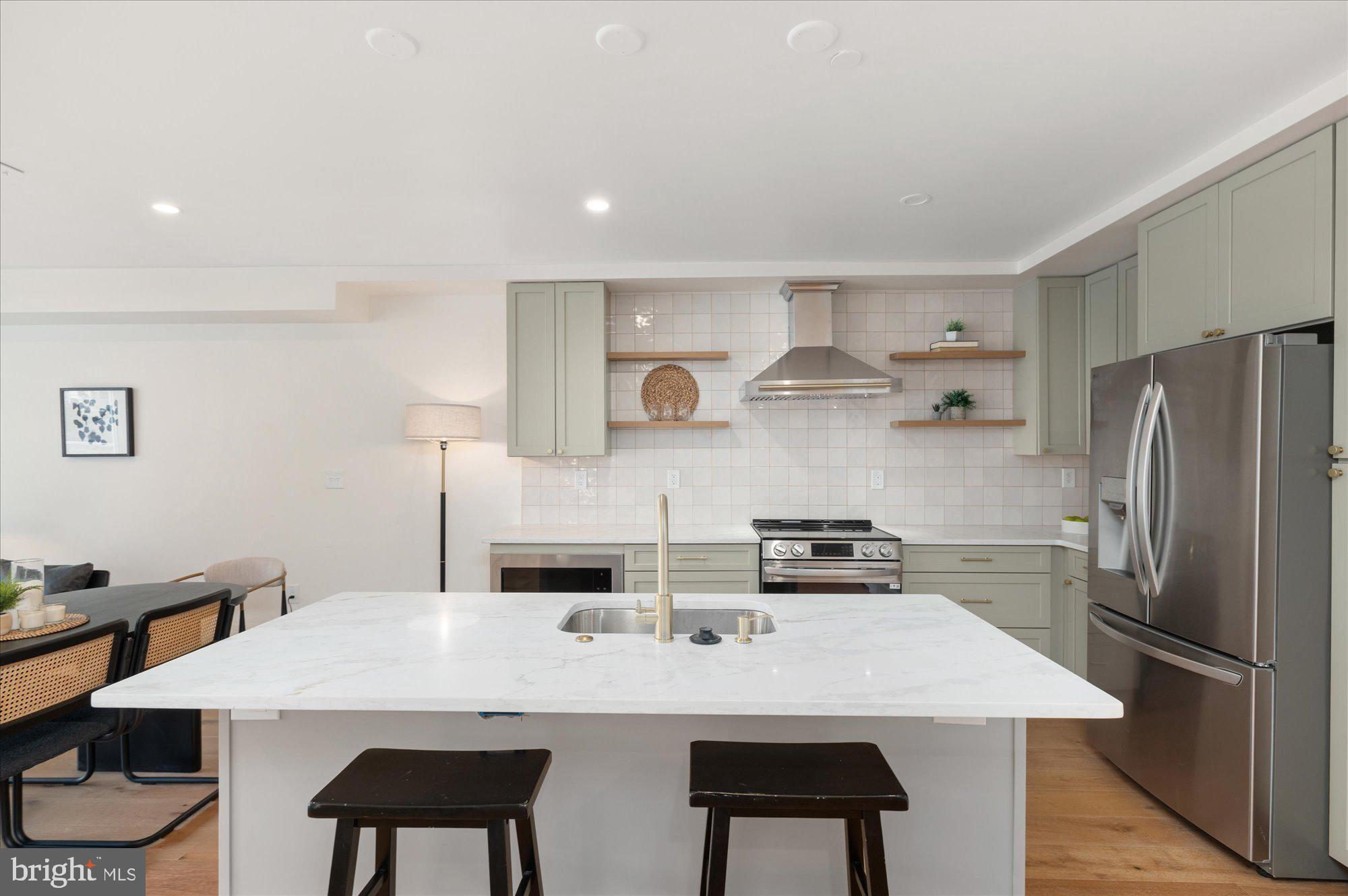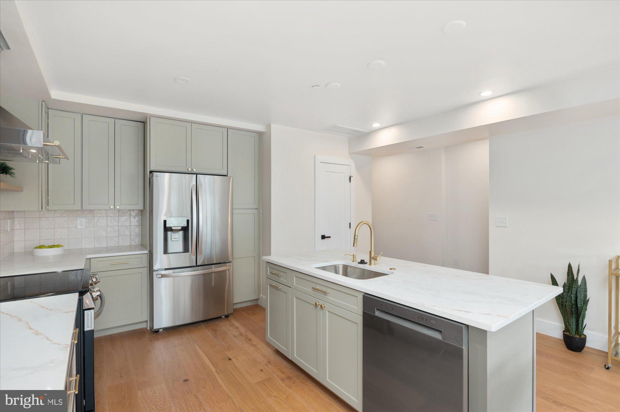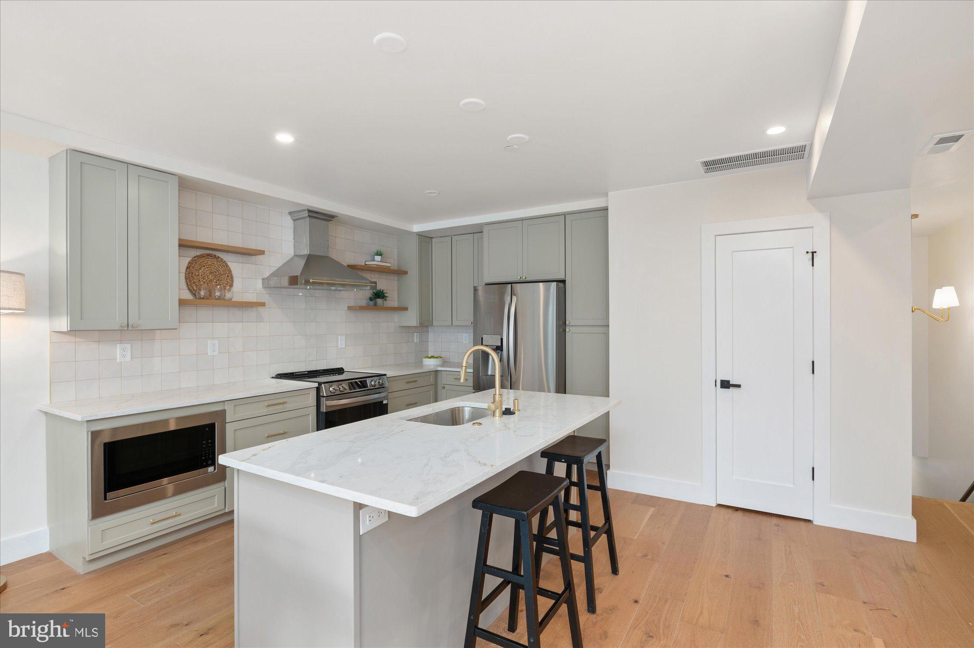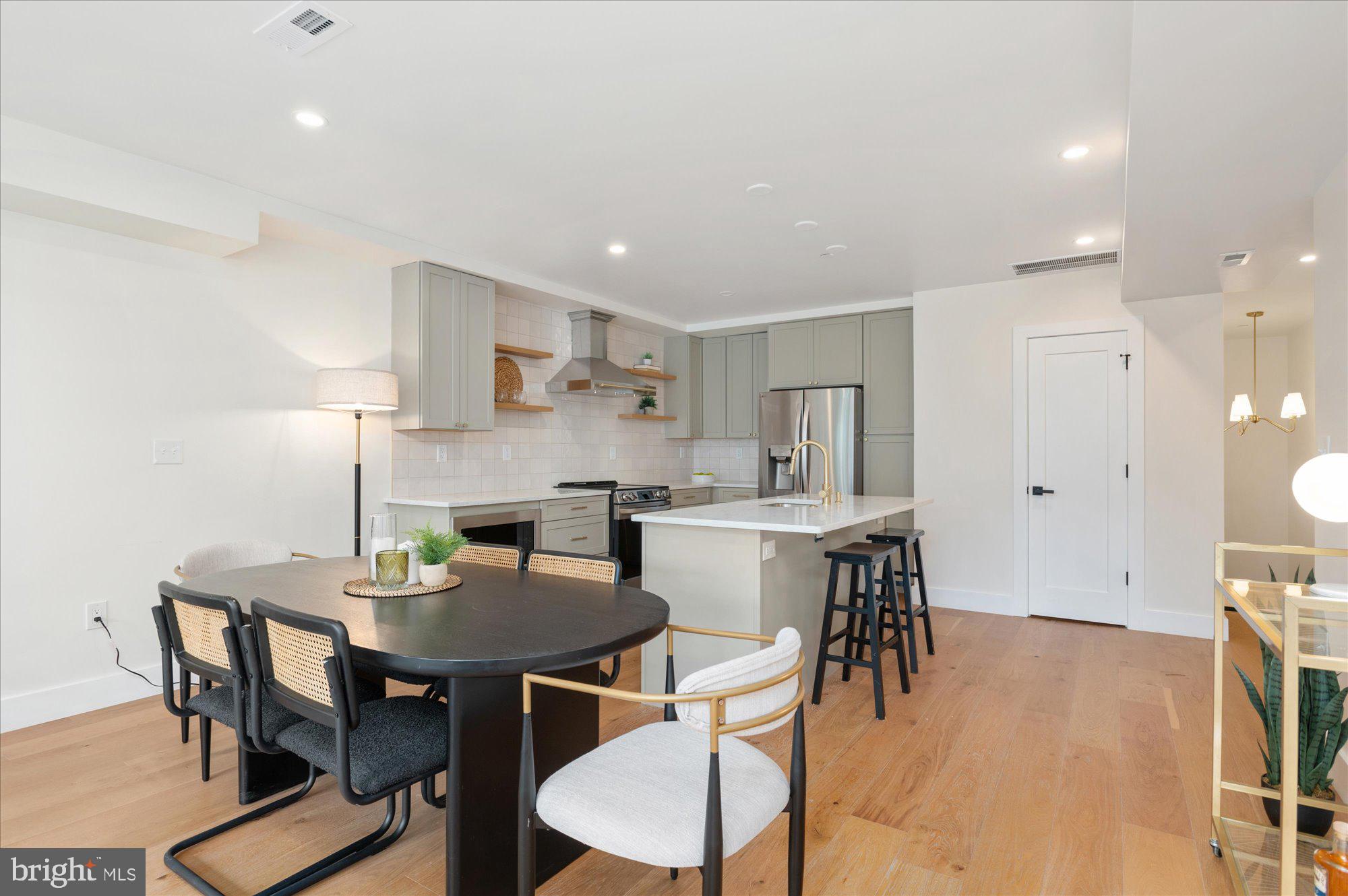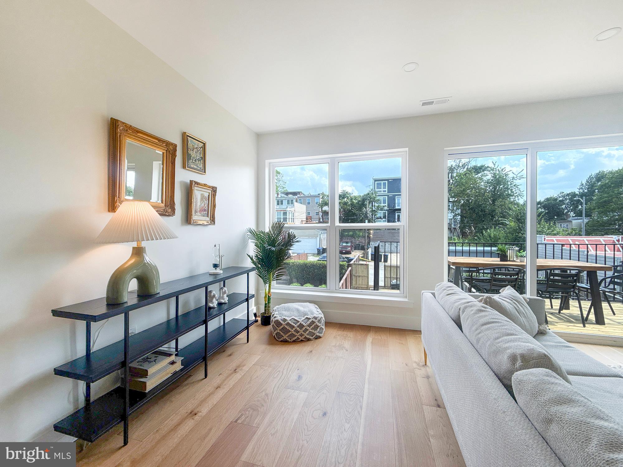 Everything here is brand new and thoughtfully designed from the ground up, with high-quality finishes, warm hardwood floors, tall ceilings, and huge windows that flood the space with natural light. The open main level has a generous living and dining area that leads to a private balcony, and a sleek kitchen with soft-close cabinetry, floating shelves, quartz counters, and a bold tile backsplash. The large center island makes a great prep space, serving zone, or hangout spot--whatever the day calls for. There's also a stylish powder room tucked off the main level.