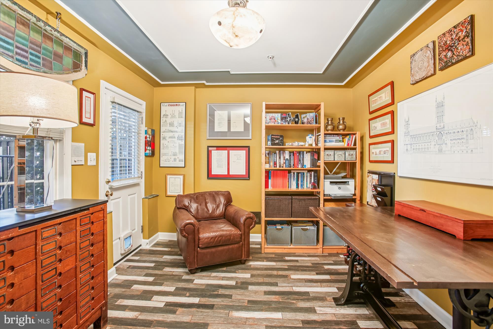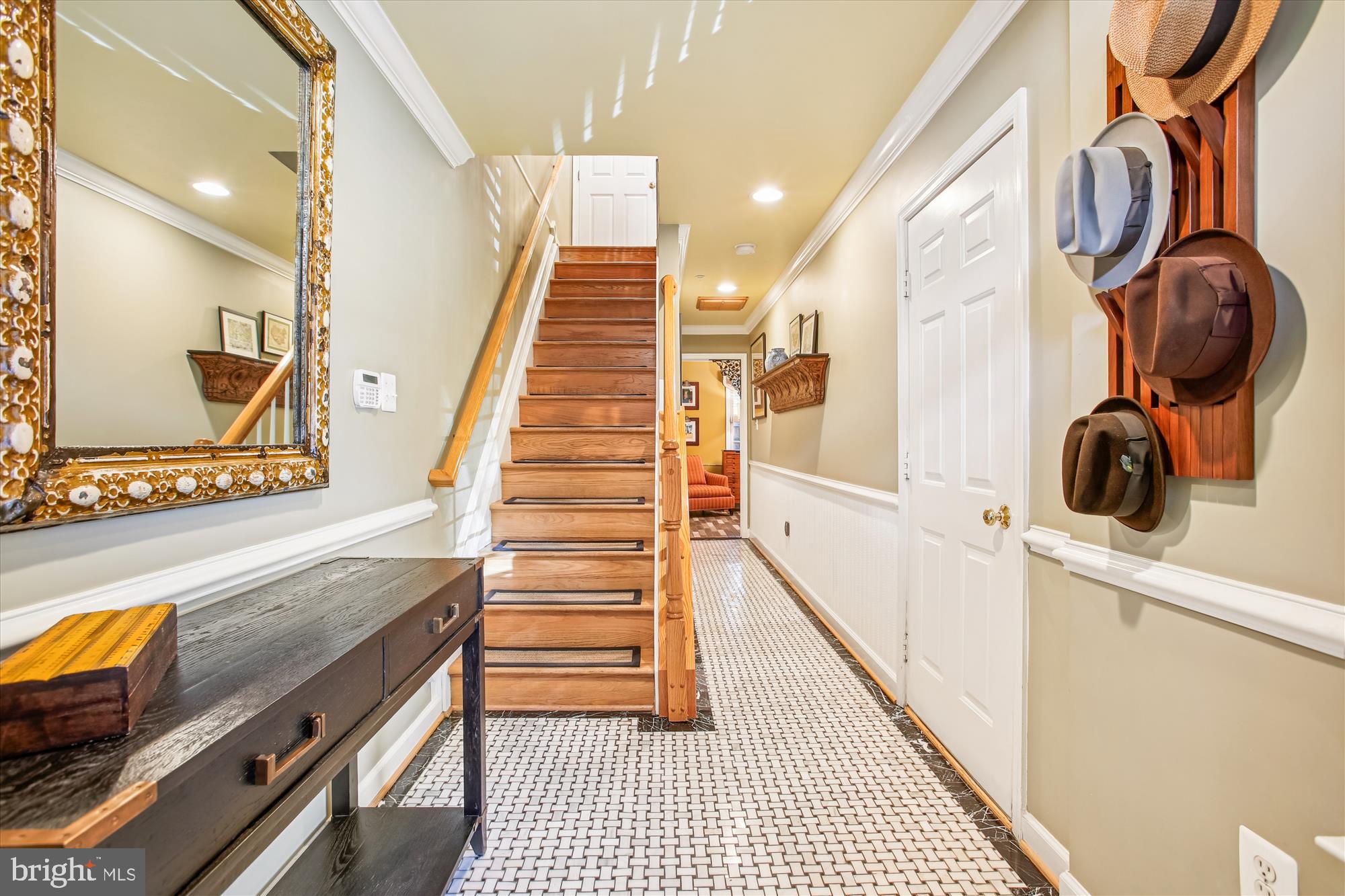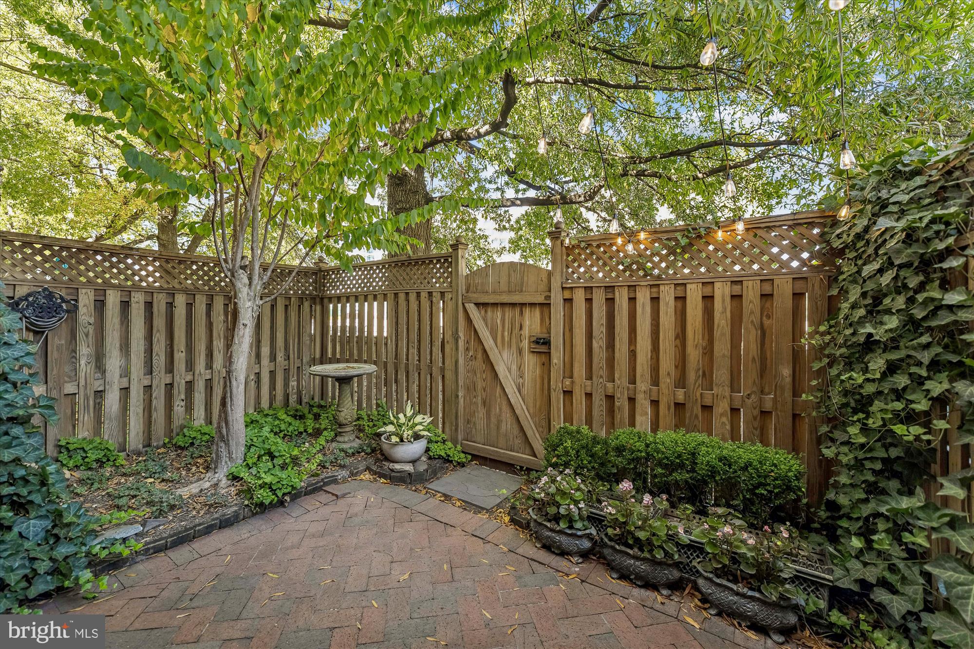 The entry level features an inviting foyer with marble basketweave floor tile, a bedroom or office with wood-look porcelain tile flooring and access to the fenced backyard with a brick herringbone patio. This level also includes a coat closet and entry to the attached garage.