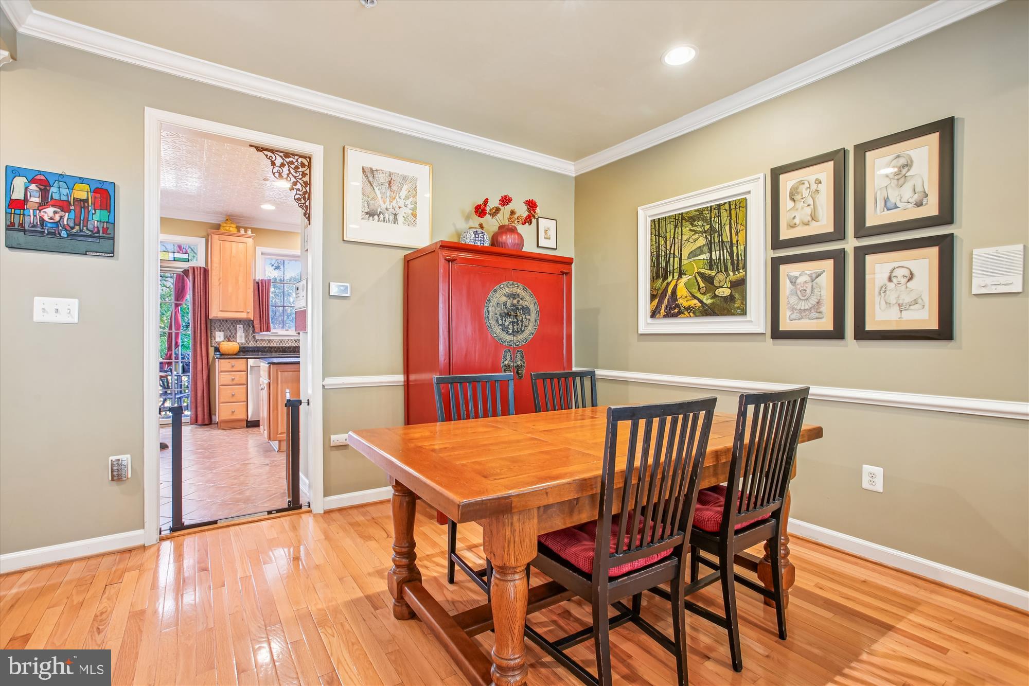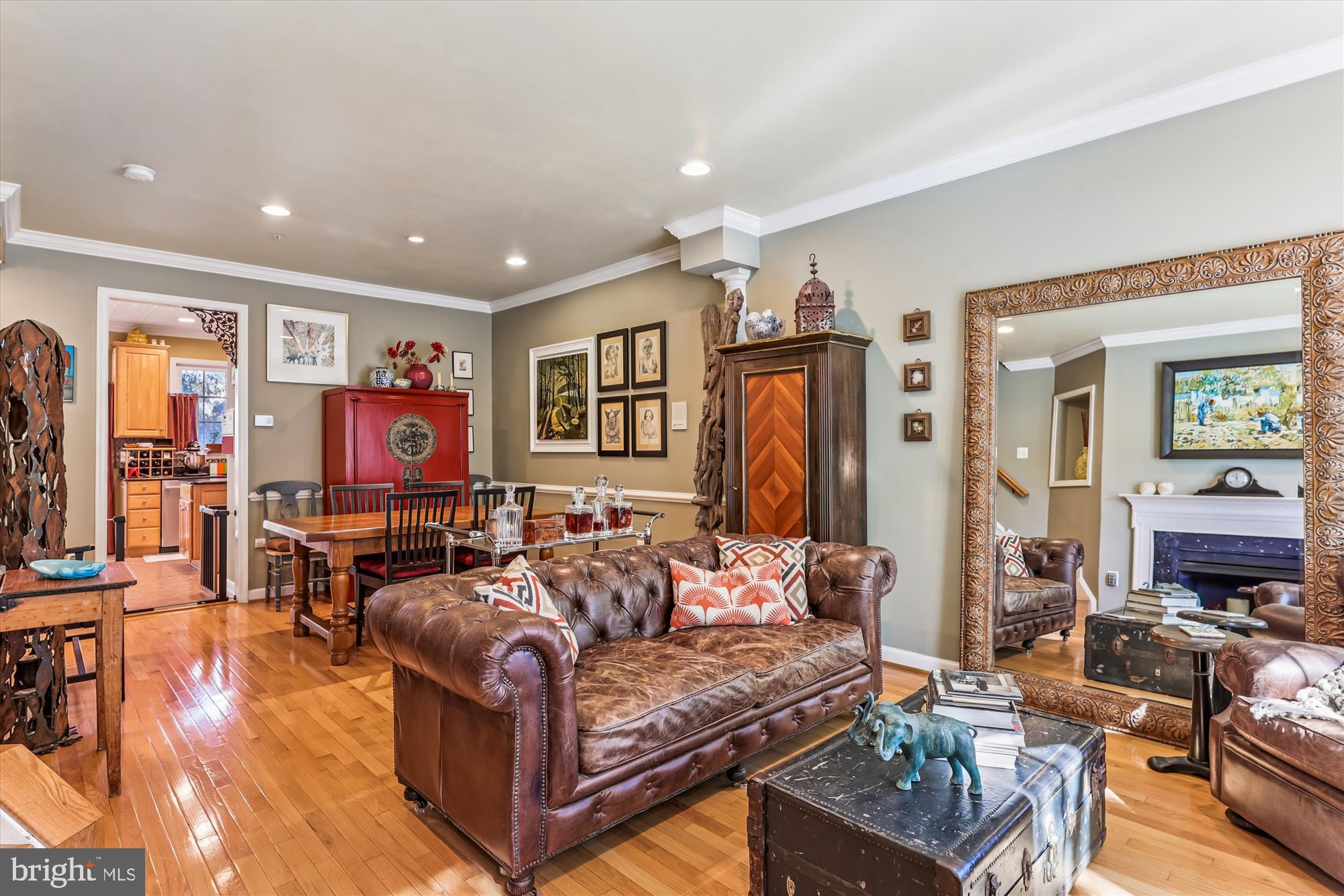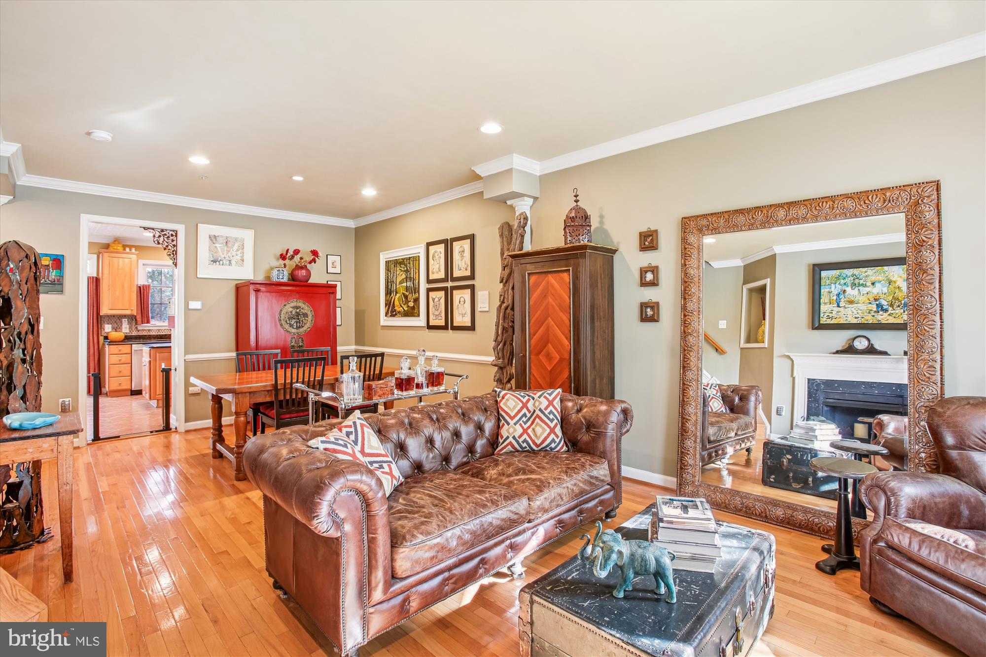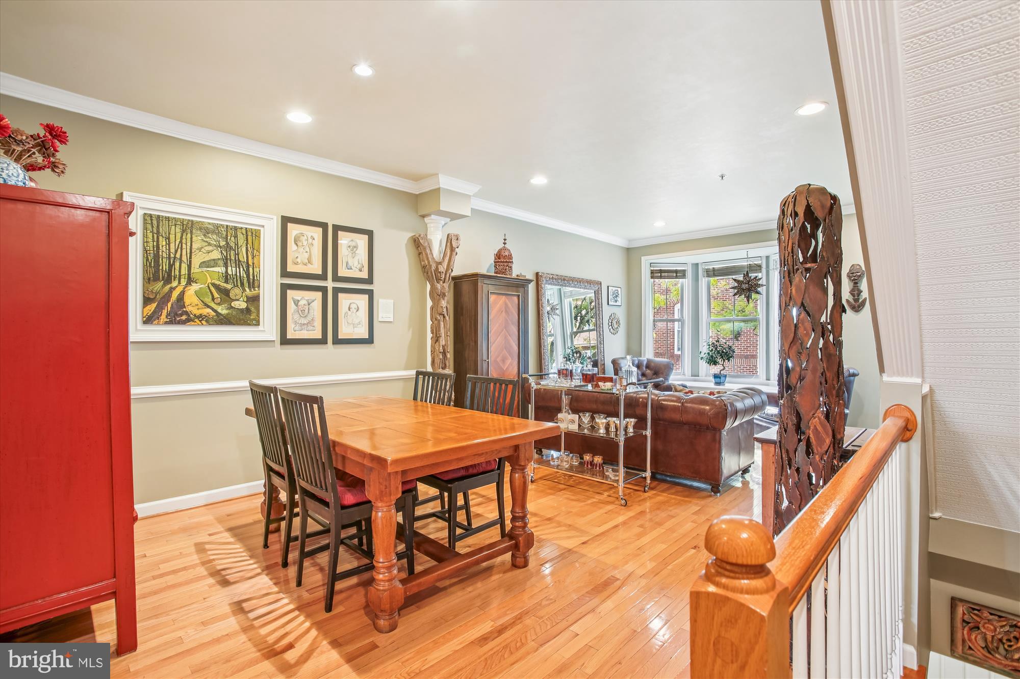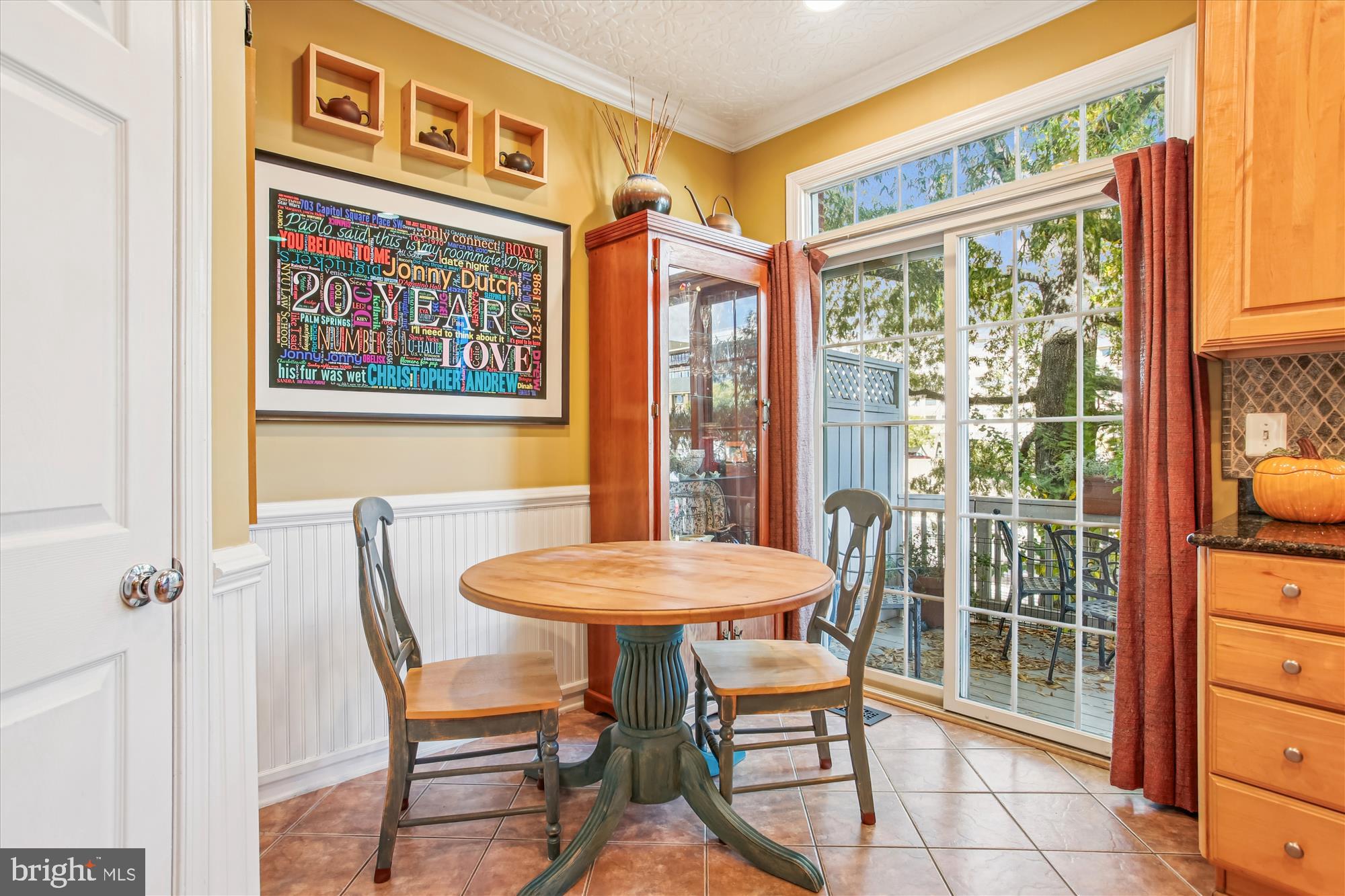 Upstairs, the main level showcases a gracious living room with a gas fireplace option (gas line is currently capped) crown and chair rail molding, and a charming bay window with a sitting ledge. The living room flows into the dining area, creating an ideal layout for entertaining. The stunning chef's kitchen includes high-end stainless-steel appliances such as a JennAir professional-style gas range and a Samsung BESPOKE refrigerator with custom panels and beverage center. Finishes include granite countertops, a center island, a diamond-patterned stone backsplash, and a pantry. The eat-in-kitchen features a bright breakfast nook with access to a large deck with TimberTech/AZEK flooring featuring a built-in gas line--perfect for grilling and outdoor gatherings. This level also includes a powder room.