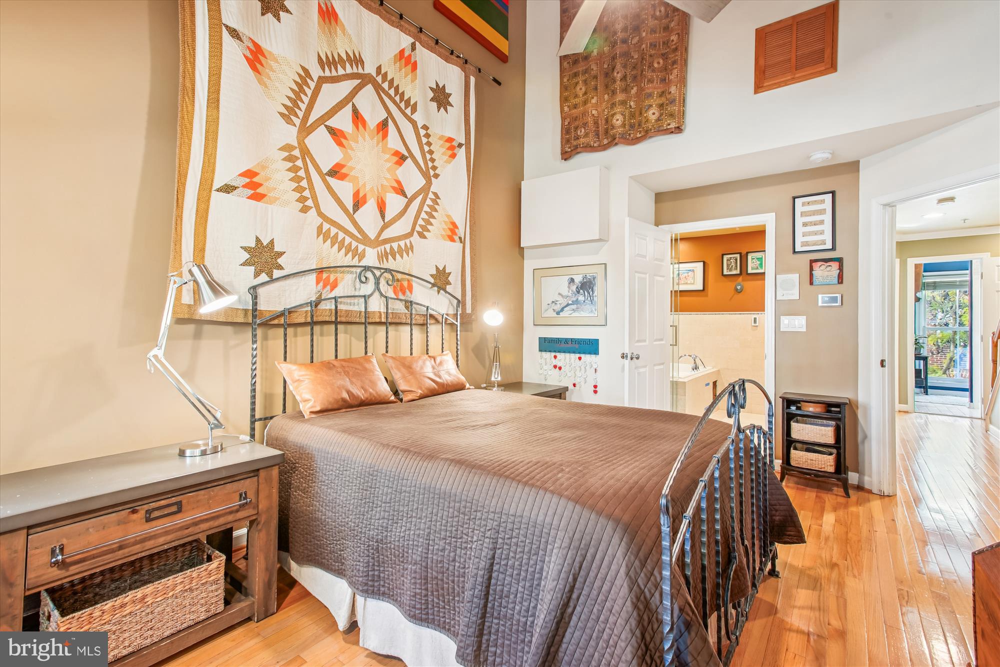On the third level, there are two spacious bedrooms and two beautifully appointed bathrooms, including a generous primary suite. The primary bedroom offers soaring ceilings, a bay window, a 12 foot-long walk-in closet with an Elfa organizing system, and a modern ceiling fan. The luxurious private bathroom features heated marble flooring, four foot high marble wall tiling, a soaking tub with an inline heater to maintain water temperature at 105degF, and a glass-enclosed two-person steam shower with bench seating, handheld sprayer, jet sprays, rain and wall showerheads, plus a double vanity. The second bedroom includes an attached bathroom with dual access to the hallway. A gas tankless water heater provides unlimited hot water for the entire home.